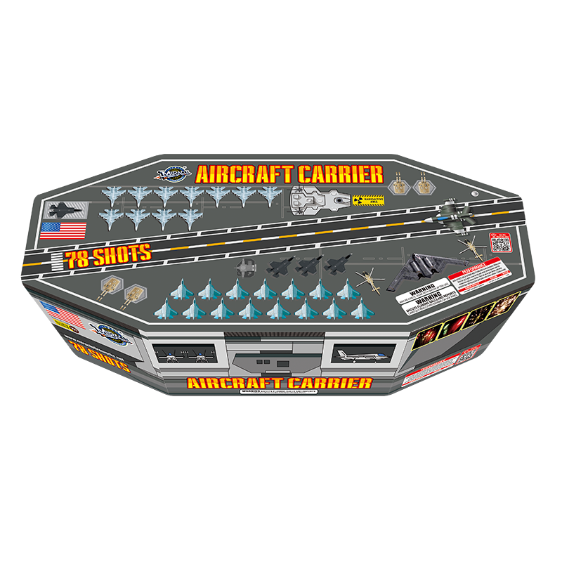 Classic carrier shaped cake with multiple cool effect! Incredible combined shooting patterns I & Z & V! Gold/flower crown+white/green strobe+blue/red. Crackling willow with red/green tips; Brocade crackling flower+lemon+blue. Gold/brocade crown. Ti-gold palm with silver sakura.
