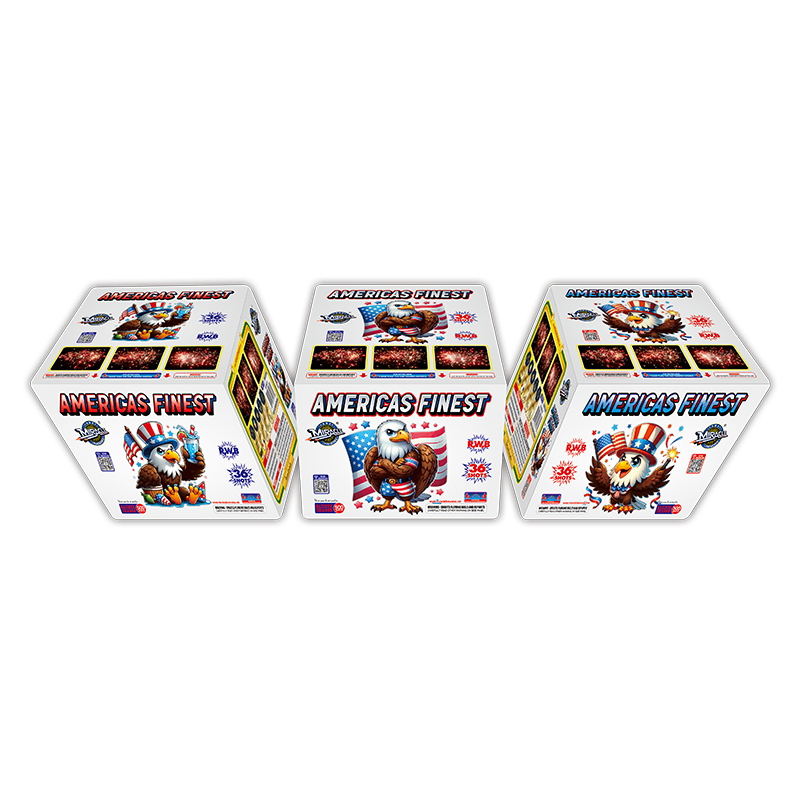 The best R,W,B 3-PC W angled compound cakes. Shoot these three 36 shots cakes together for a 108-shot backyard show. Red/white/blue tail up to white strobe with red/blue. Visual delight!